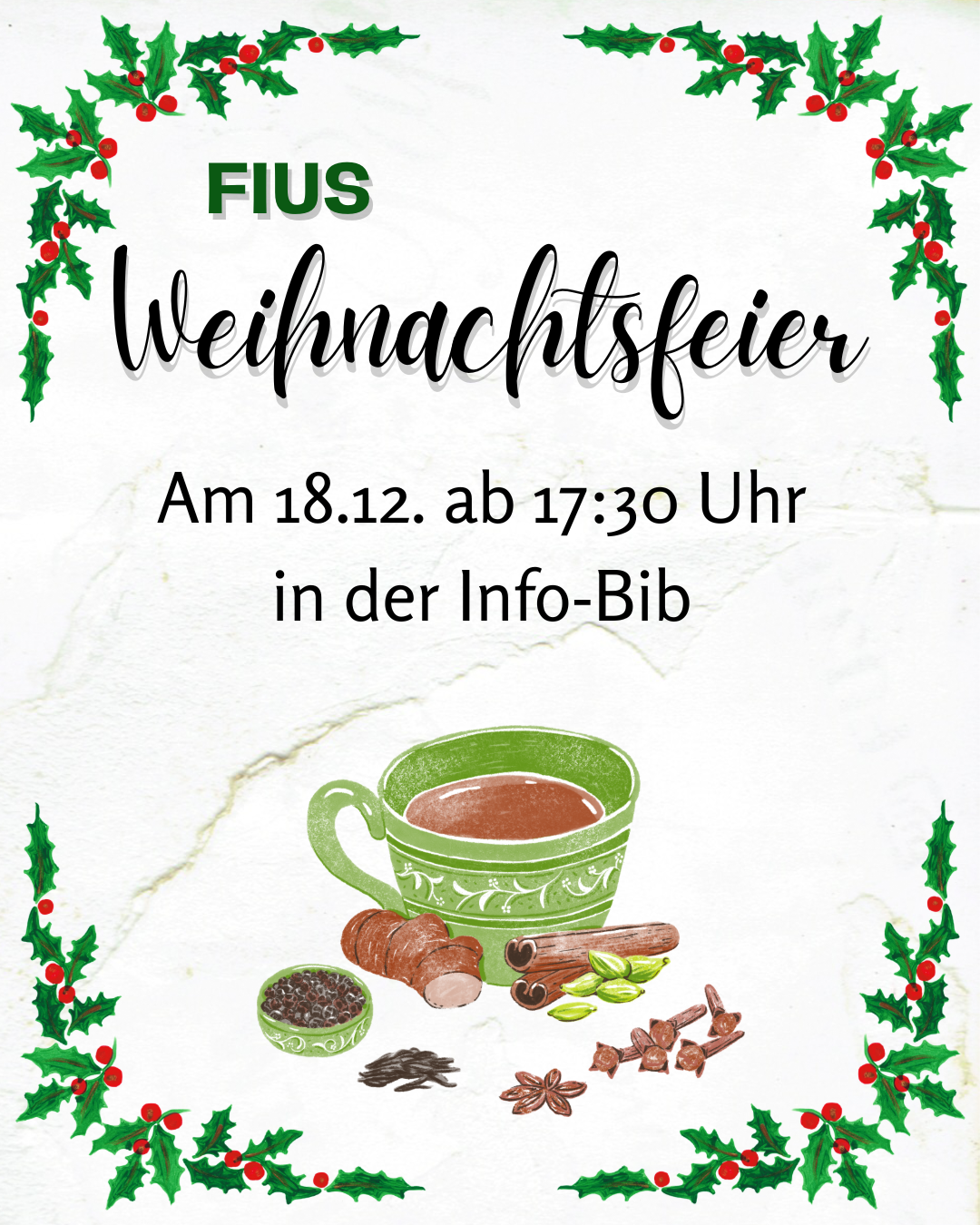 Die Weihnachtsfeier findet wie gewohnt in der Infobib (V38.008) statt. Start ist um 17:30 Uhr. Neben Glühwein, Hot Aperol, Kinderpunsch und Snacks wird es Crêpes und andere Weihnachtsleckereien geben.